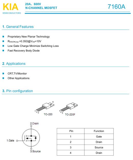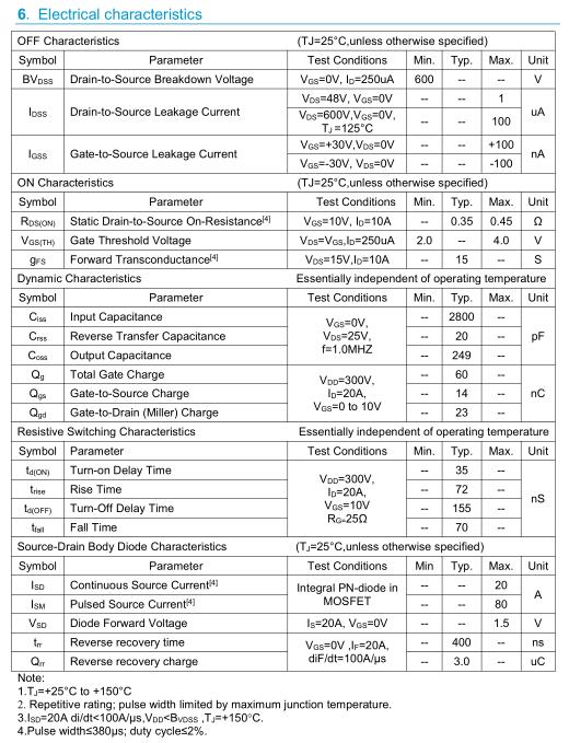 參數: ID(A): 20 BVDSS(V): 600 RDS(ON): 0.19 Package: TO-220F